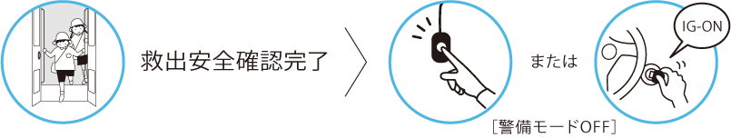 確認ボタン押下またはイグニッション(IG)-ONで警報は解除(警備モードOFF)されます。